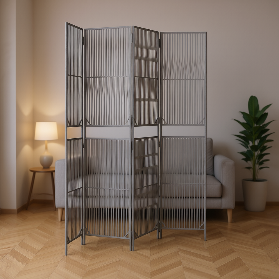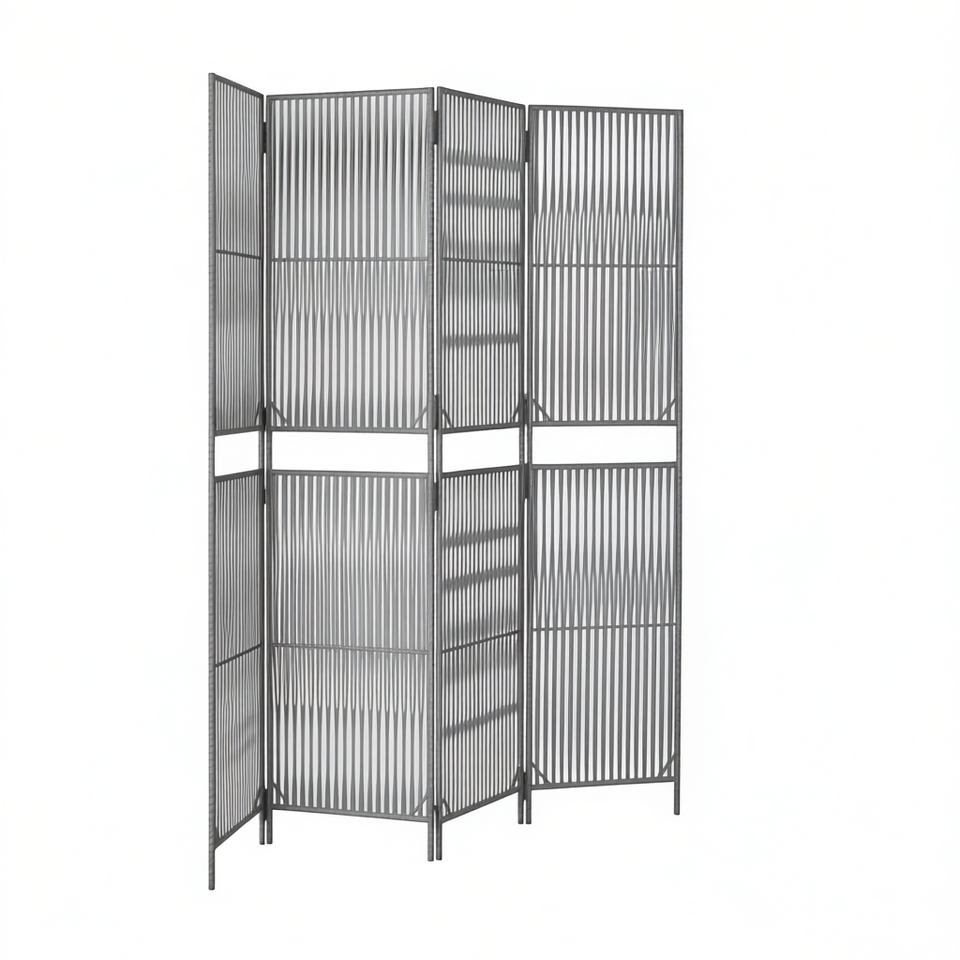 Paravent moderne pliable en polyrotin gris à 4 panneaux, design translucide
