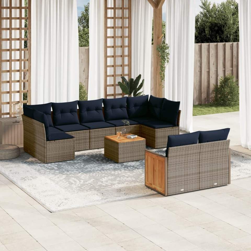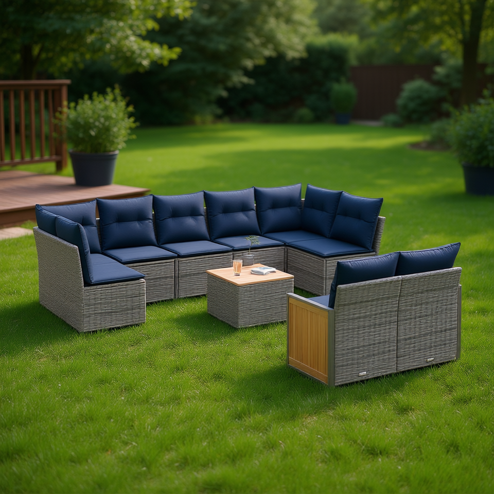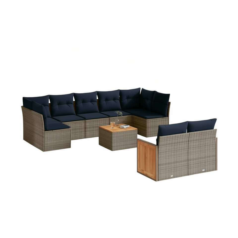 Ensemble de canapés de jardin en polyrotin gris 10 pièces avec coussins, mobilier d'extérieur au design contemporain, structure en teck