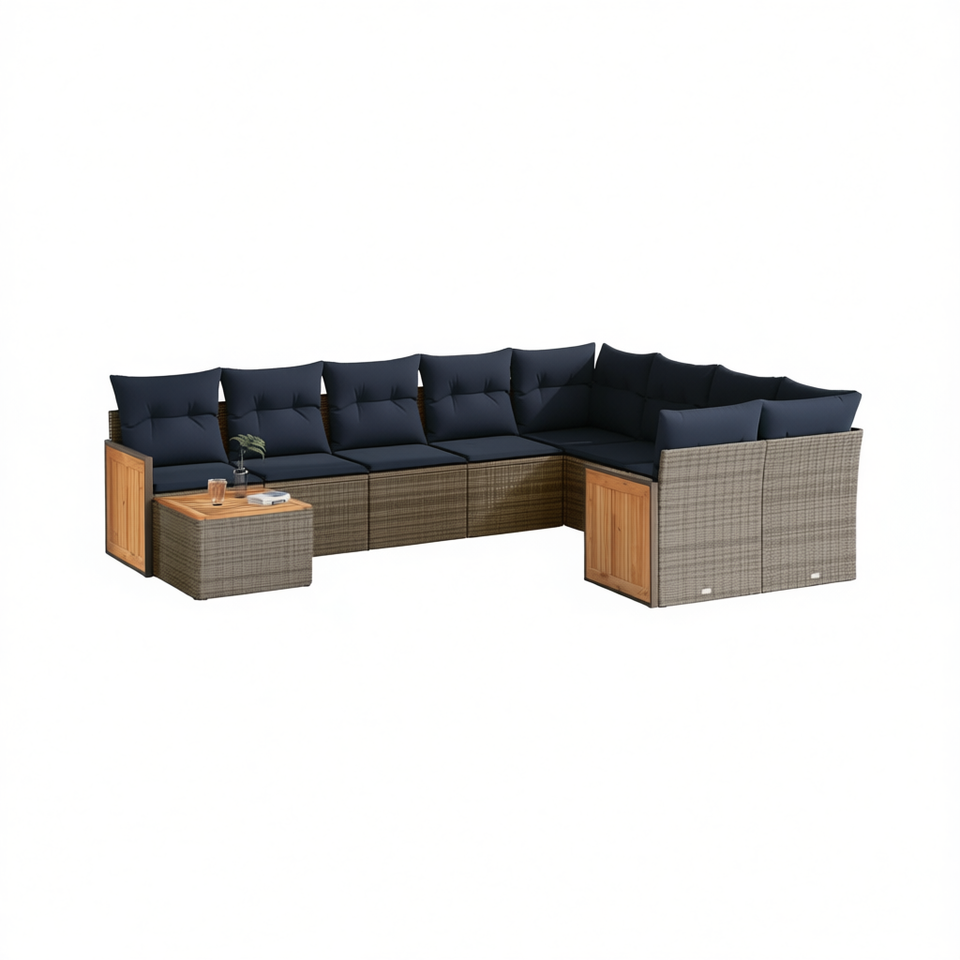 Ensemble de canapés de jardin en polyrotin gris avec coussins, 10 places, mobilier d'extérieur, structure en teck, design contemporain