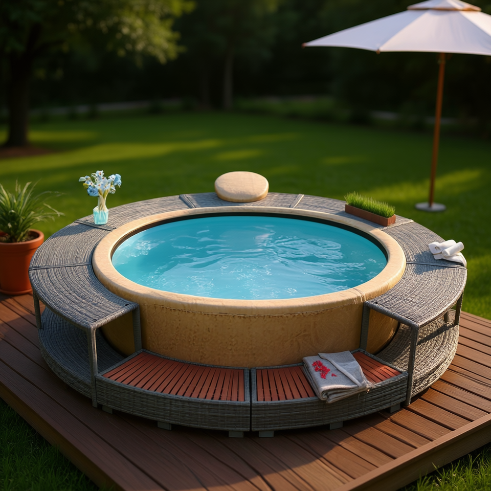 Environnement de spa en polyrotin gris, rond, autoportant, accessoire pour spa, design contemporain, fonction de bain relaxant