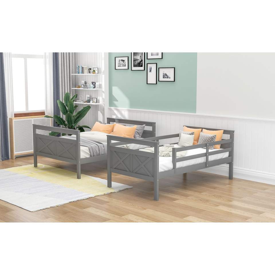 Lit superposé gris double sur grand lit avec échelle et barrière de sécurité pour chambre à coucher
