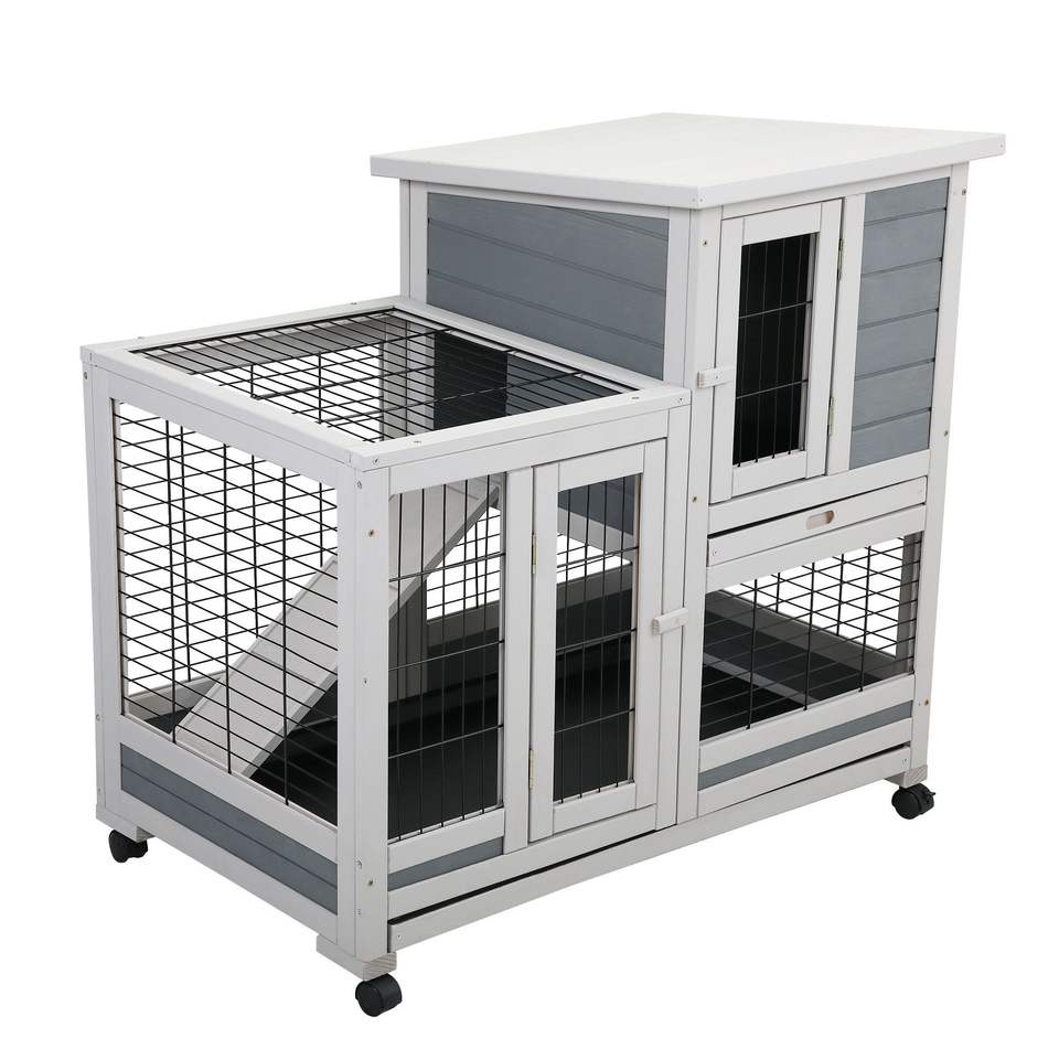 Clapier à lapins en bois gris avec porte ouvrable Ventilation Grille Clôture Plateau de nettoyage pour l'extérieur Pet Bunny House Furniture