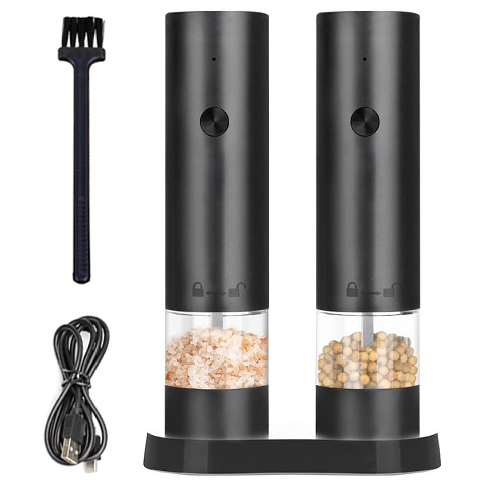 Excellent lot de 2 moulins électriques automatiques à sel et poivre en plastique noir avec base – Ensemble essentiel de moulins électriques à sel et poivre