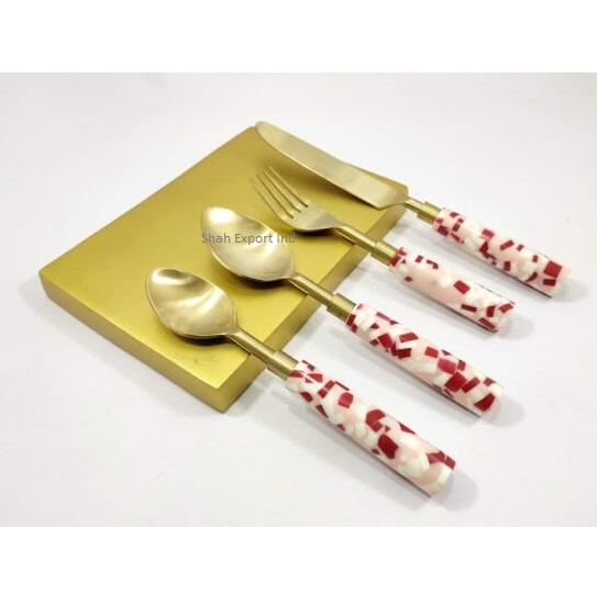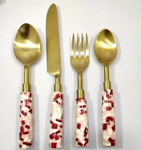 Grand ensemble de couverts en métal doré design avec poignée en résine imprimée pour la maison, le mariage, le dîner et la table.