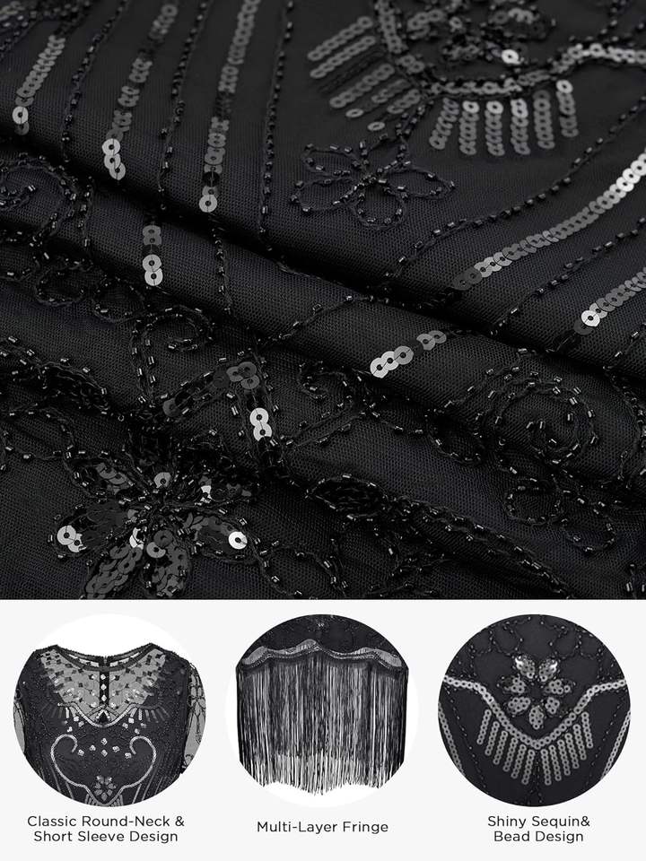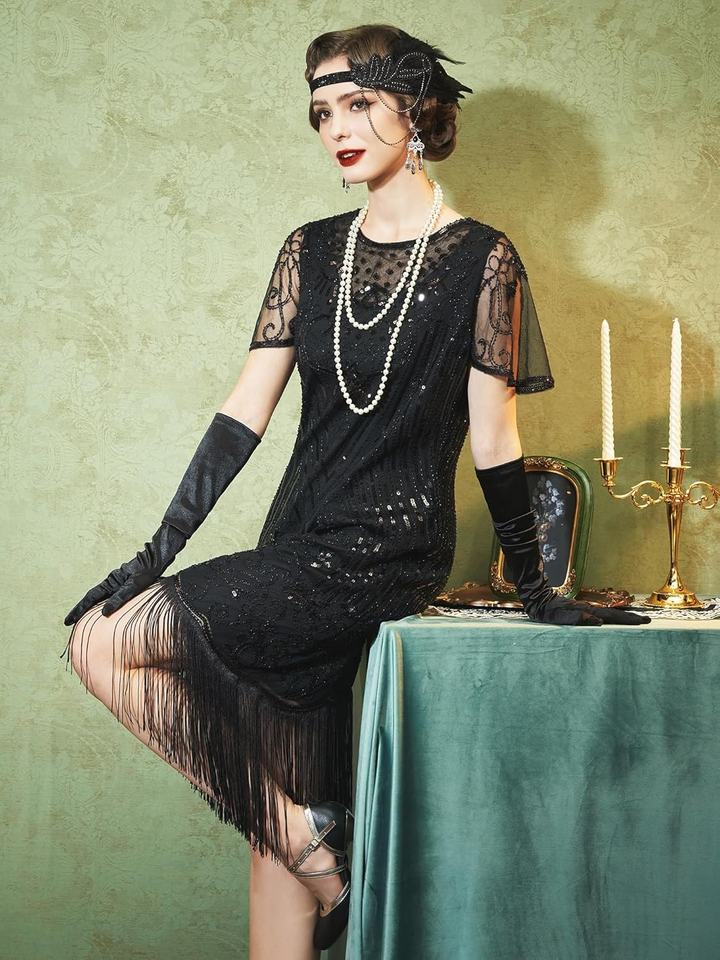 Robe Flapper Col Rond Style Great Gatsby - Robe Longueur Thé Années 20 pour Femme Manches Longues - Costume Diamant Années 20