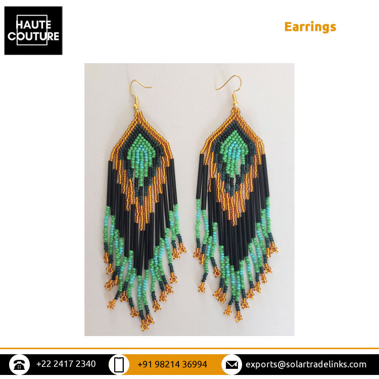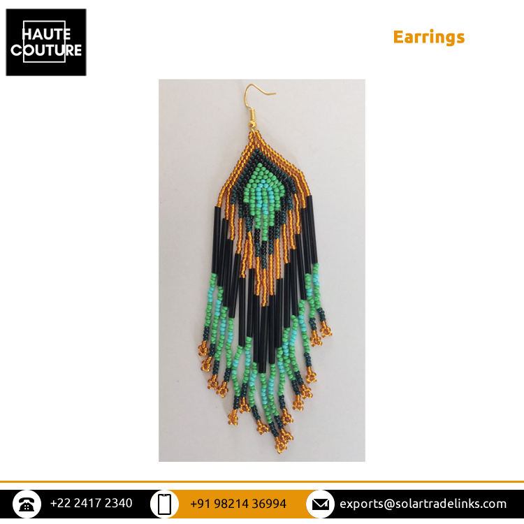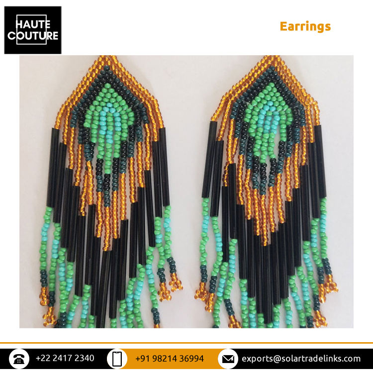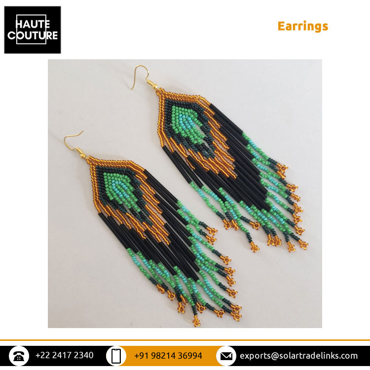 Grand fabricant indien vendant des boucles d'oreilles en perles tube long avec des glands noirs et dorés de qualité incomparable pour des vêtements décontractés et d'extérieur