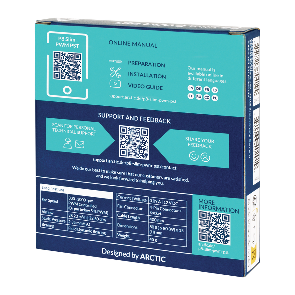 ARCTIC P8 Slim PWM PST -PC Fan,80 mm Case Fan, Optimised for Static Pressure PST, DC Fan, Ultra Slim 15 mm, 300-3000 rpm - Black