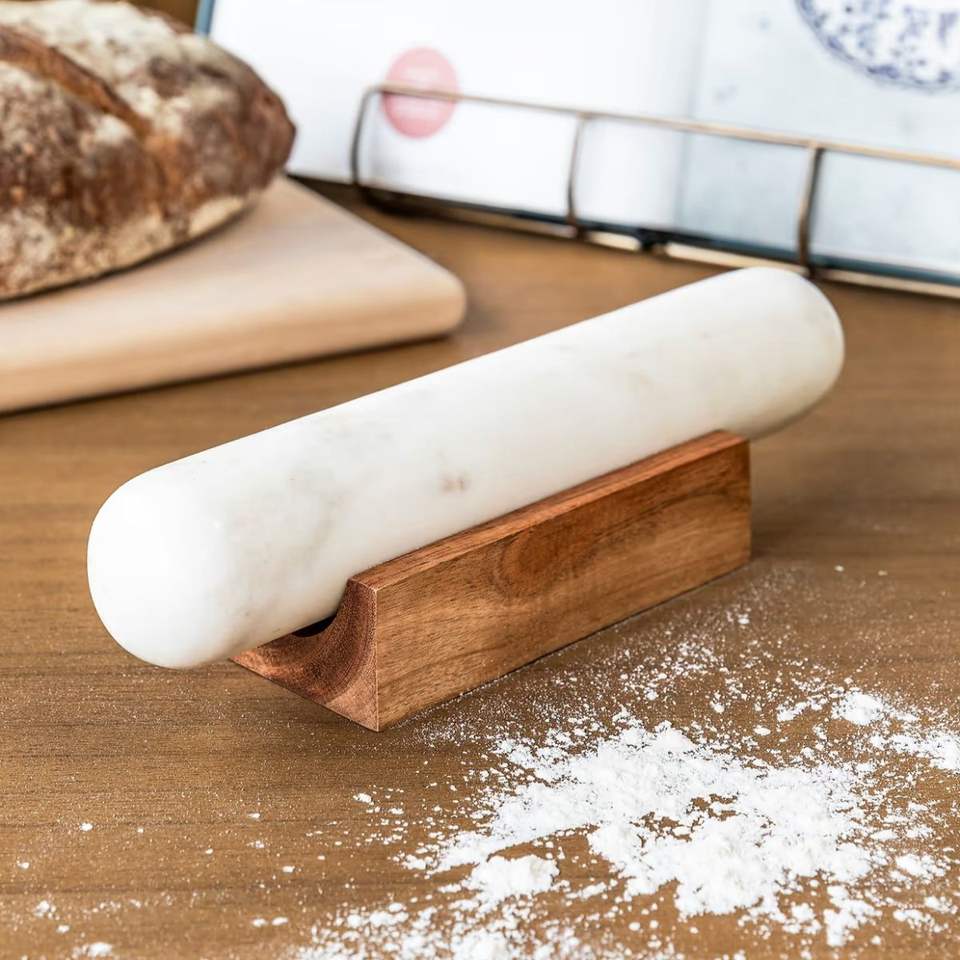 Rouleau à pâtisserie en marbre de grande qualité à prix raisonnable, apportant une touche esthétique à la cuisine tout en offrant un nivellement professionnel de la pâte.