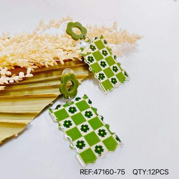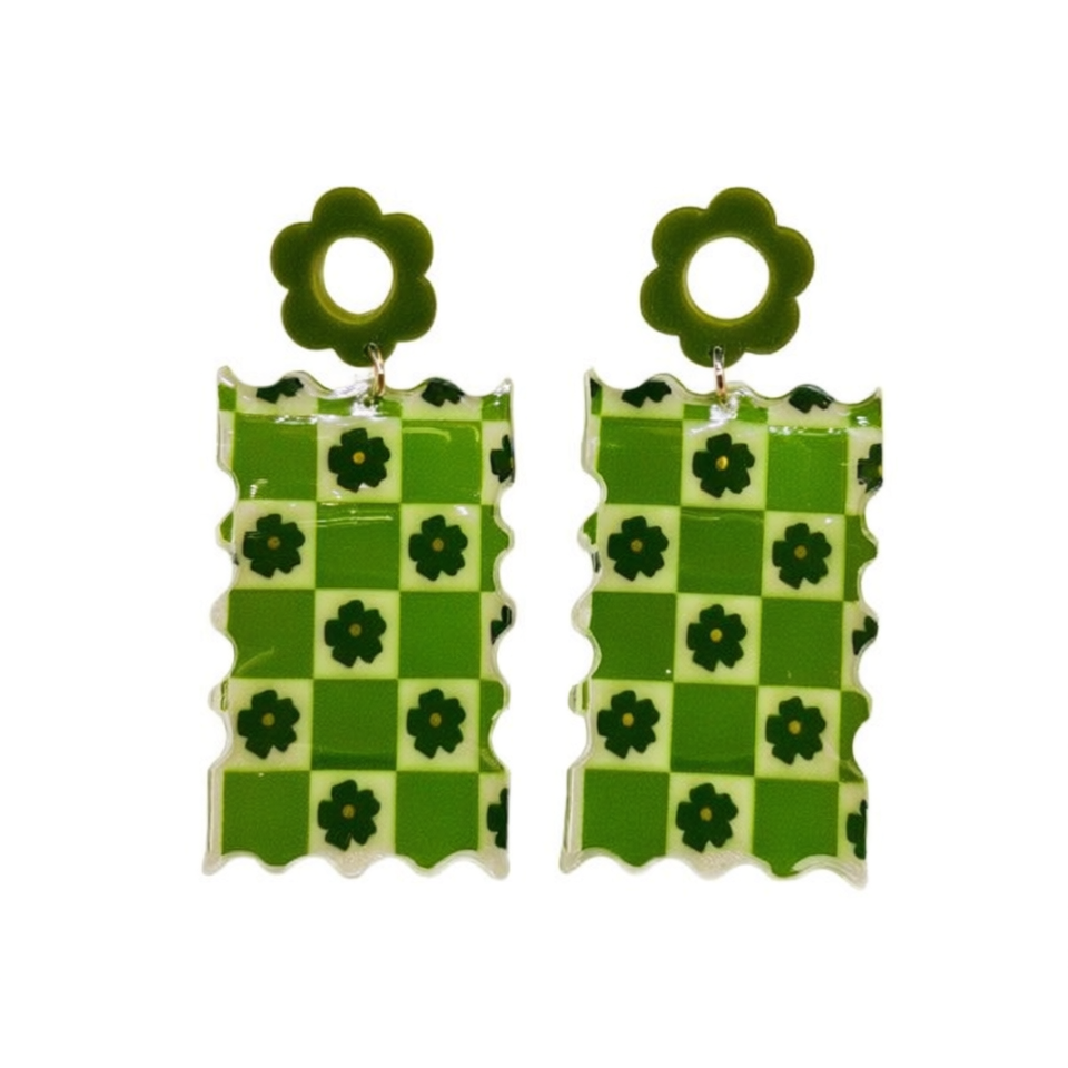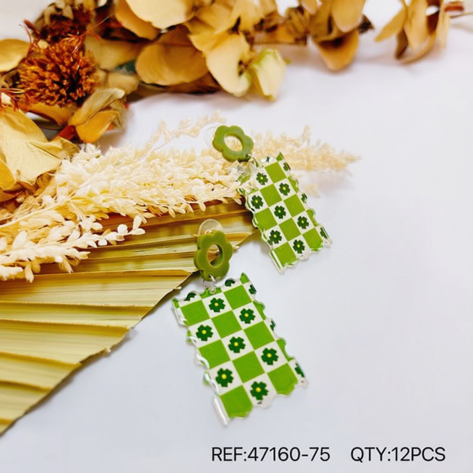 Boucles d'oreilles pendantes à carreaux verts avec motif floral, bijoux fantaisie pour femmes, en résine acrylique, ensemble cadeau tendance