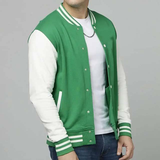 Vestes universitaires pour hommes de couleur verte, col montant, logo sur le devant, service OEM ODM, 100% coton, sur mesure, en vente