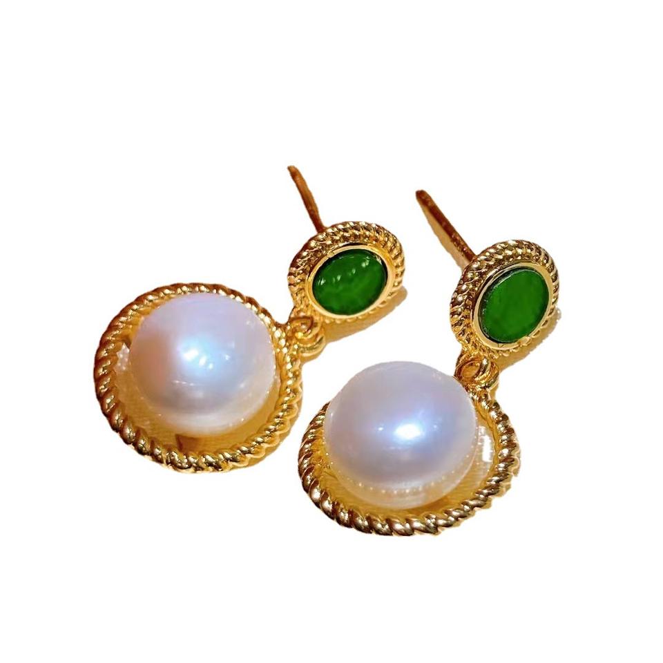 Green Freshwater Pearl Earrings with New Ethnic Retro Style Fresh and Fashionable Inlaid Ring Design