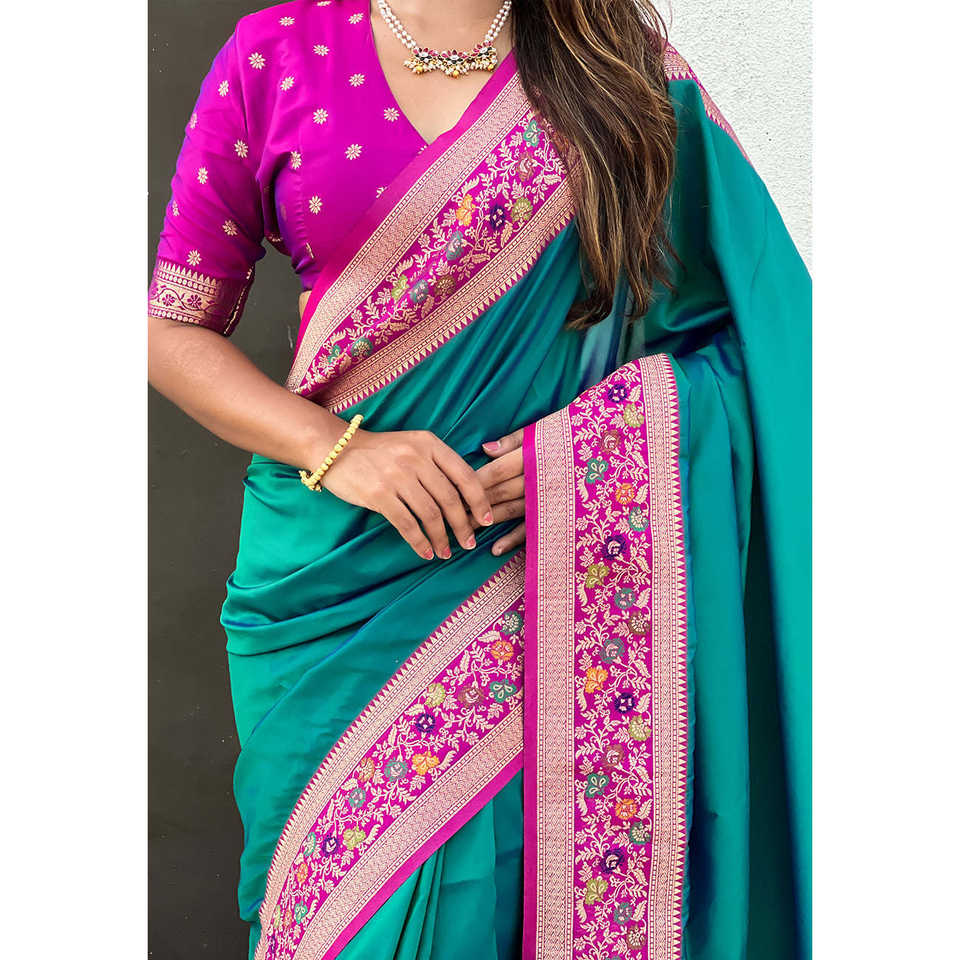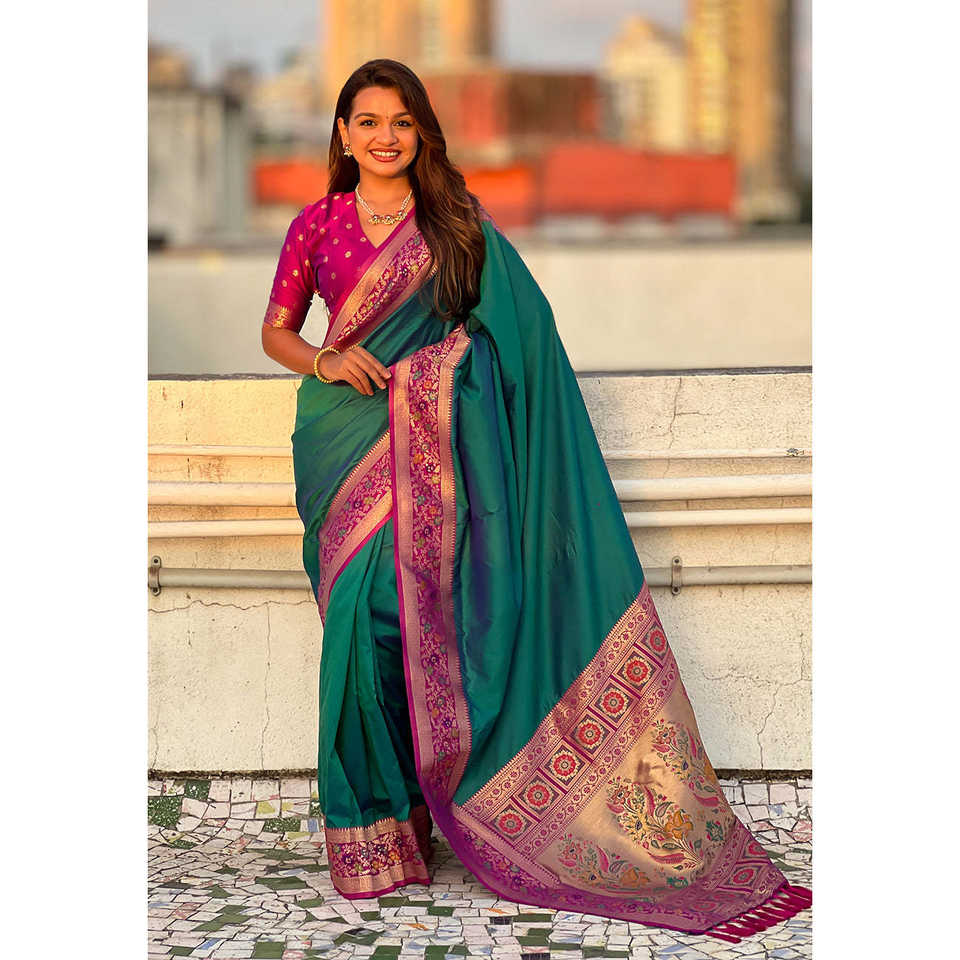 Green Gala Silk Saree with Paithani Pallu Kadiyal Zari Woven Elegant Evening Dresses with Intricate Zari Work