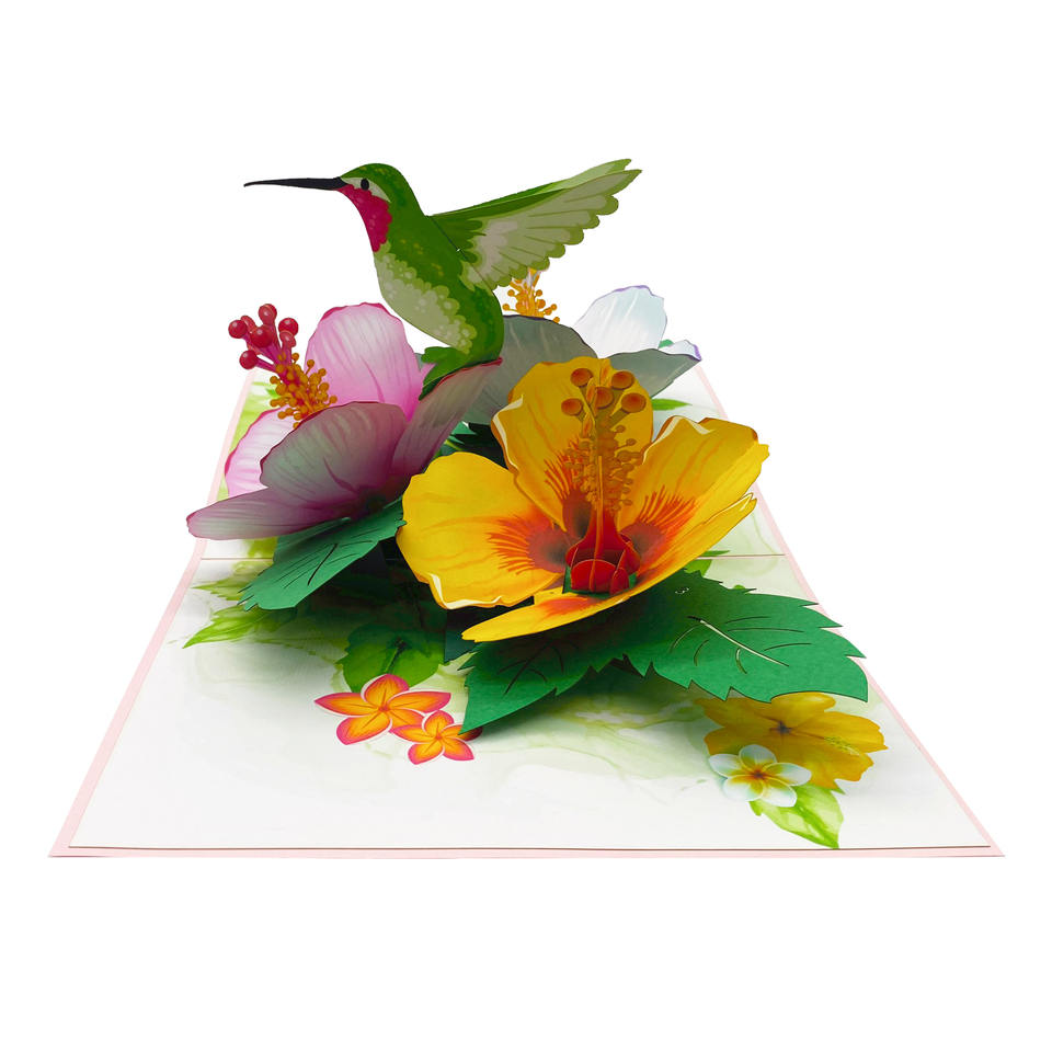 Meilleure vente Conception personnalisée artisanale en papier pop-up 3D faite à la main Colibri vert et Hibiscus Cadeaux tendance du Vietnam
