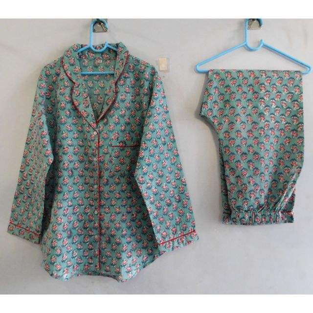 Ensemble de pyjama en coton décontracté pour femmes indiennes vertes, été printemps, col en V, longueur totale, imprimé floral fait à la main, vêtements de nuit confortables