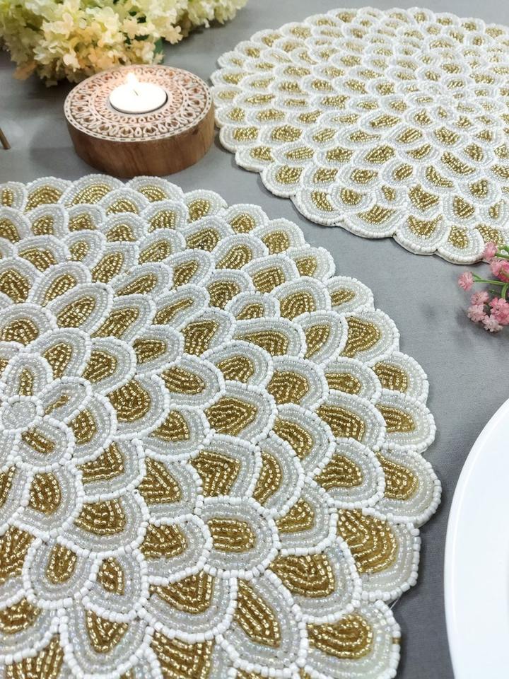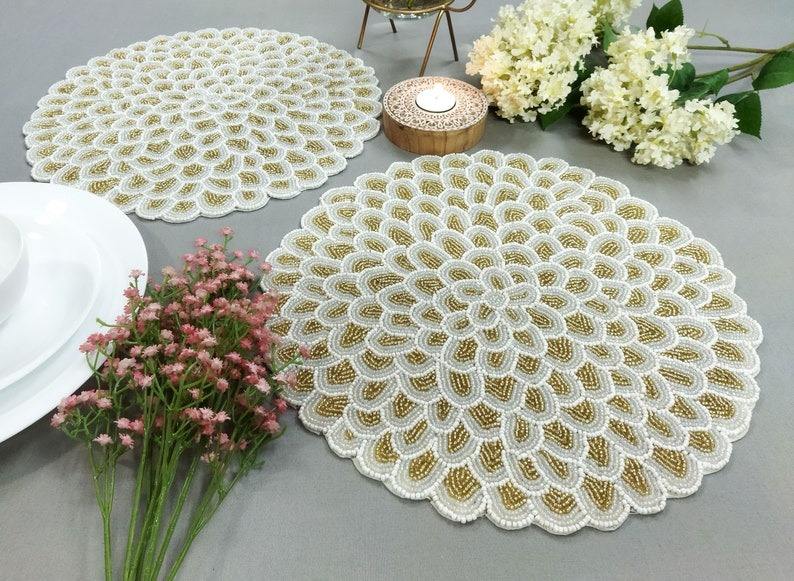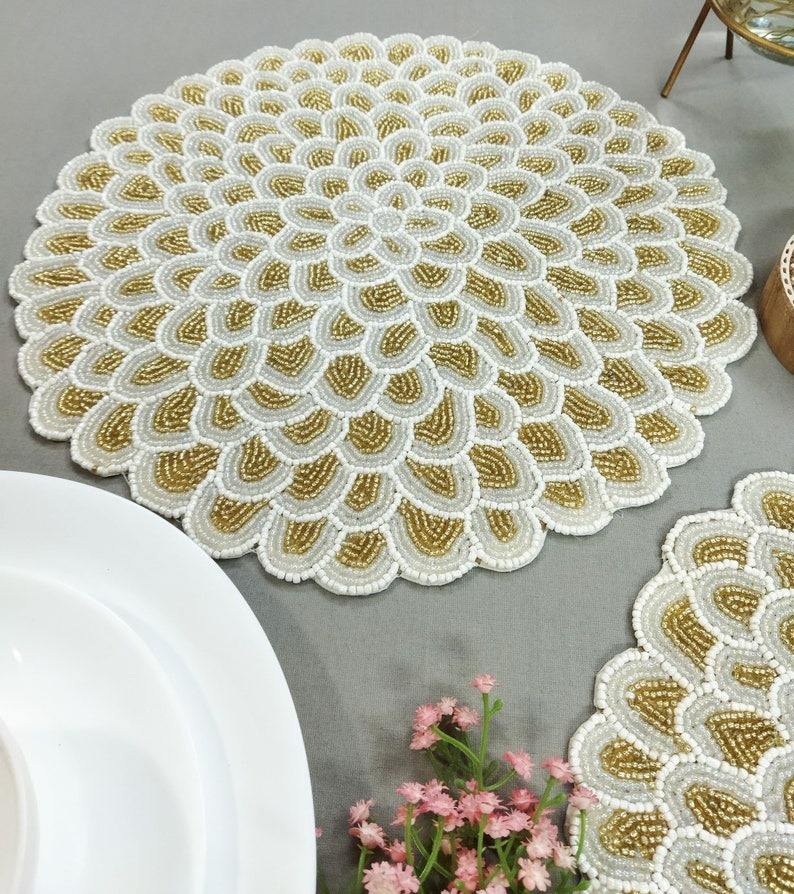 Green Leaf Beaded Placemat Floral Nature-Inspired Embellished Drink Mats for Hotel Home Decor Woven Table Mat for Handmade