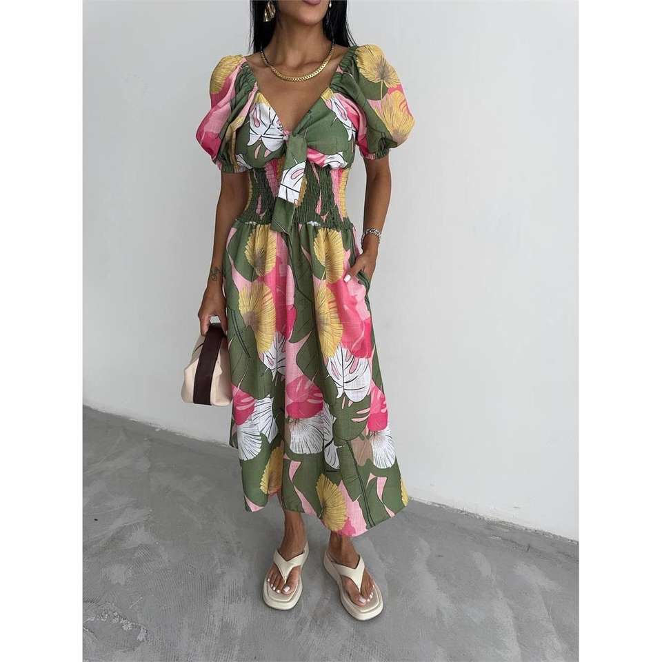 Robe en lin à motif de feuilles vertes, col montant, décontractée, grande taille, conception ODM, tailles XS-XL, éco-responsable, décolleté sans bretelles