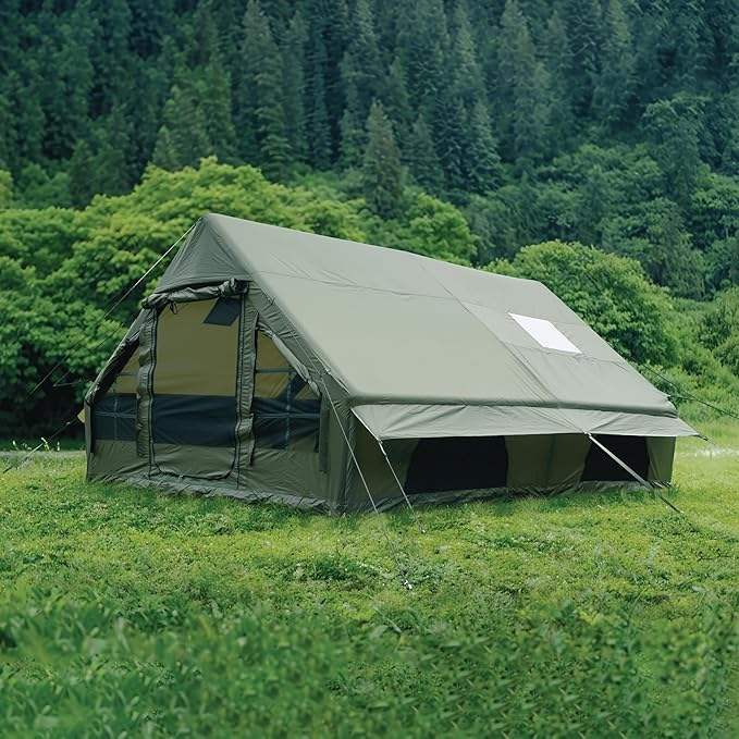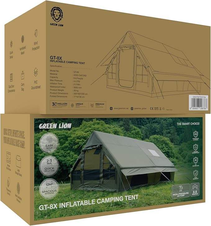 Tente de camping gonflable Green Lion pour 6 à 8 personnes, double couche, quatre saisons, pompe à air, Oxford imperméable, sac de transport, résistant aux déchirures