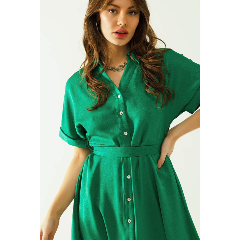 Green Relaxed Belted Mini Dress Front Button Placket Draped Decor Natural Waistline Breathable Knee-Length Everyday ODM Supply
