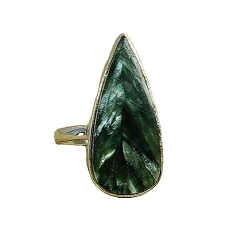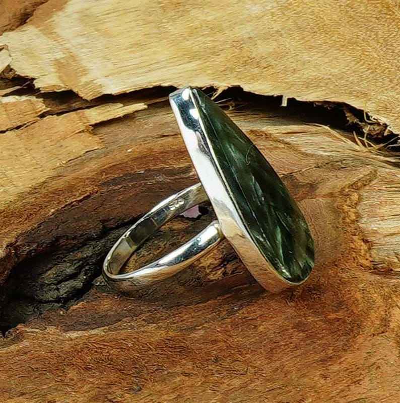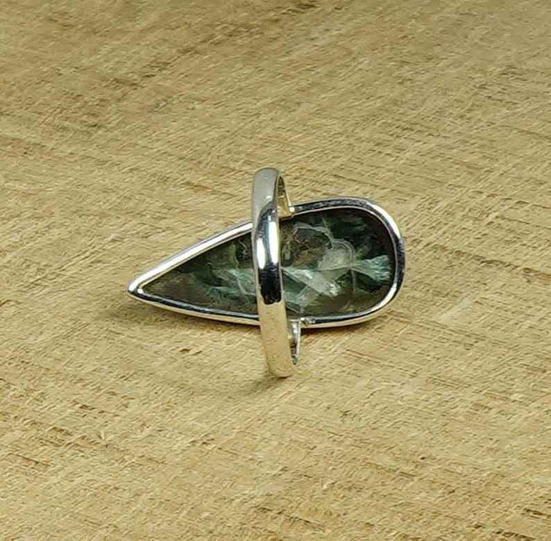 Bague de fiançailles et de mariage fantaisie en pierre naturelle Séraphinite verte, sertie clos, en argent sterling 925, taille brillant, faite à la main