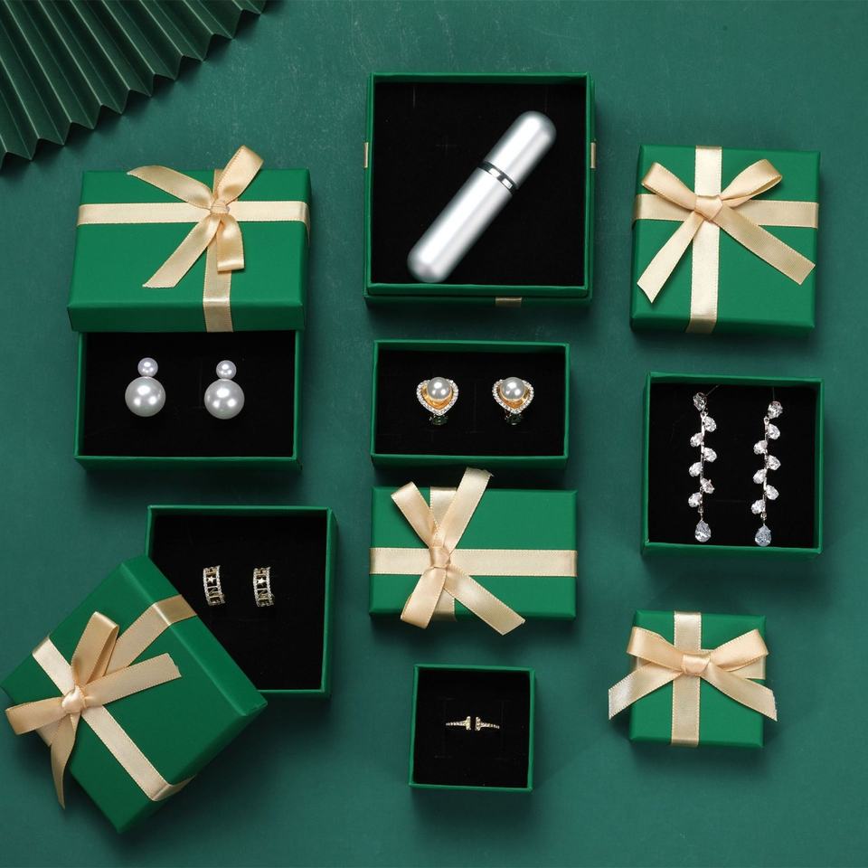 Boîte à bijoux en papier vert unique avec nœud et sac en papier pour femme, pour collier, bague, broche, avec insert en velours noir et éponge