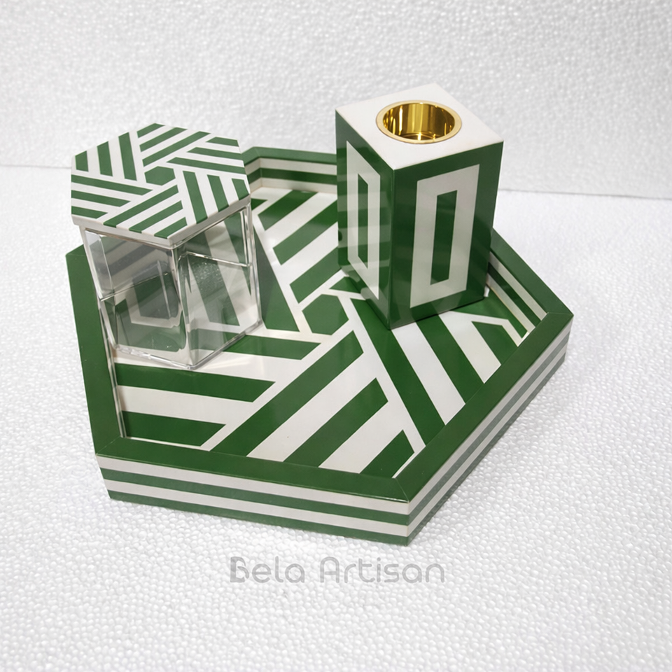 Ensemble de brûleurs hexagonaux écologiques en acier inoxydable avec incrustation d'os blanc vert Plateau décoratif fait à la main avec pot