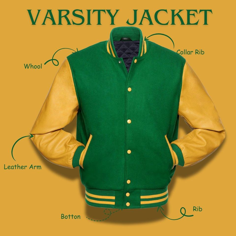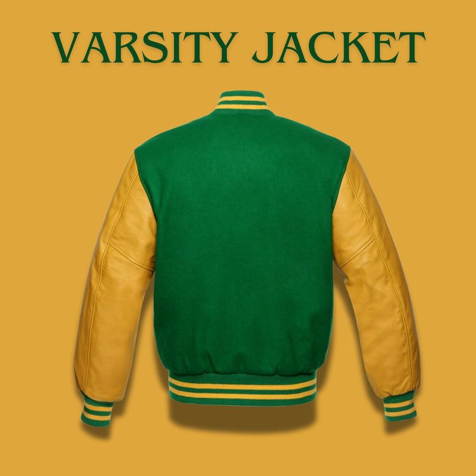Veste universitaire de style unique vert et jaune avec poches avant et traitement enduit d'ourlet côtelé