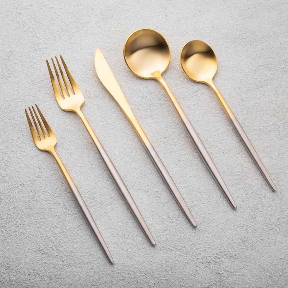 Ensemble de couverts gris et or, vaisselle moderne et élégante, parfait pour les dîners de luxe, les célébrations, les mariages et l'usage domestique. Fabriqué en Inde.