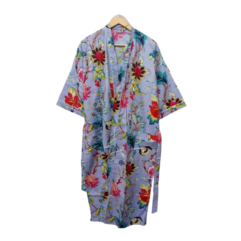 Robe kimono longue en coton gris à motifs floraux, légère, imprimée au bloc, faite à la main, pour la détente et le spa estival