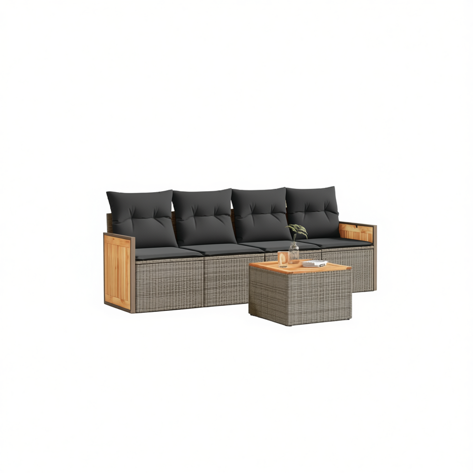Ensemble de canapé de jardin en rotin gris avec structure en teck, 4 places, mobilier d'extérieur, design contemporain, résistant aux intempéries
