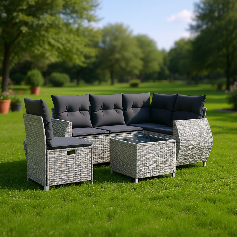 Ensemble de canapés de jardin en rotin gris 6 places, mobilier d'extérieur au design contemporain, structure en acier avec rangement