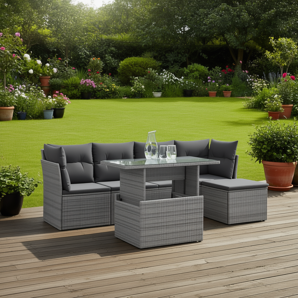 Grey Pe Rattan Garden Sofa Set With Steel Frame And Tempered Glass Outdoor Furniture For Garden Contemporary Design 6 Seater