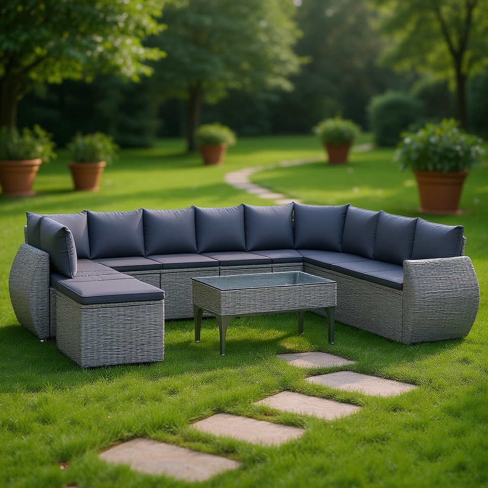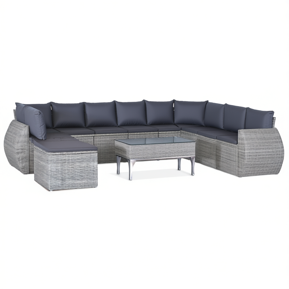 Ensemble de canapés de jardin en rotin gris avec structure en acier, 10 places et plus, mobilier d'extérieur contemporain