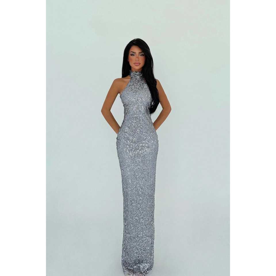Robe de soirée formelle grise Shion ODM, col montant, brodée, coupe trapèze, silhouette fourreau, taille empire, décoration strass, taille XL