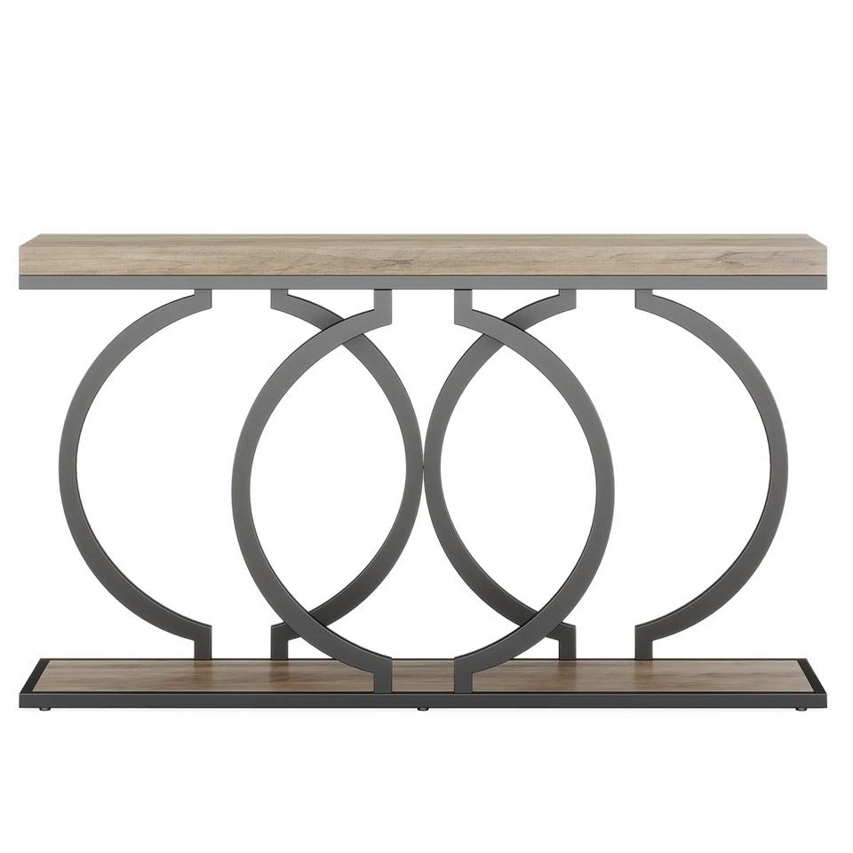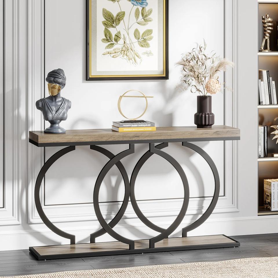 Table console convertible grise effet vieilli avec miroir, cadre circulaire en métal géométrique, mobilier moderne pour entrée d'appartement