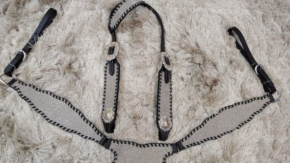 Grey White Bling Horse Tack Set Black Buckstitch Headstall Breast Plate Genuine Leather Lightweight Seasonal Horse Ridding Items