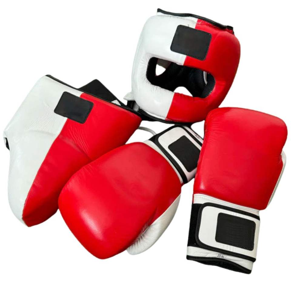 Ensemble de protection de boxe gris et blanc, comprenant un casque en cuir à lacets, des gants et une protection inguinale, ensemble de boxe 3 pièces