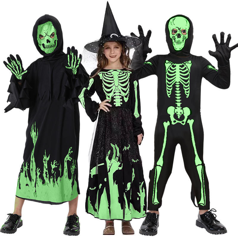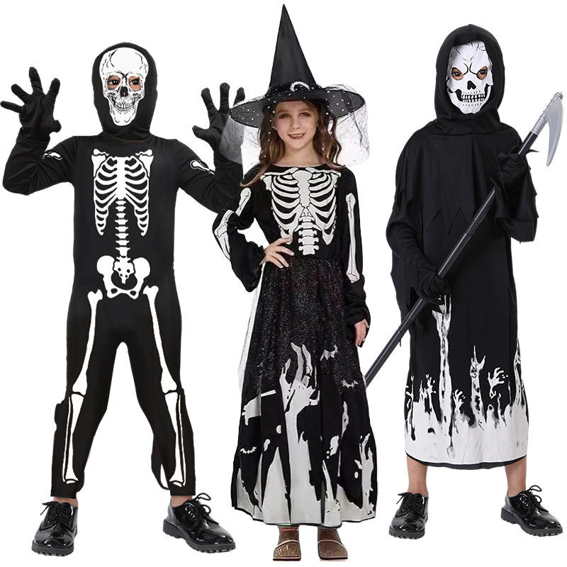 Combinaison de cosplay Grim Reaper Skeleton Phantom Ghostface pour enfants filles avec chapeau pour Halloween Carnaval Déguisements Fête Jeu de rôle