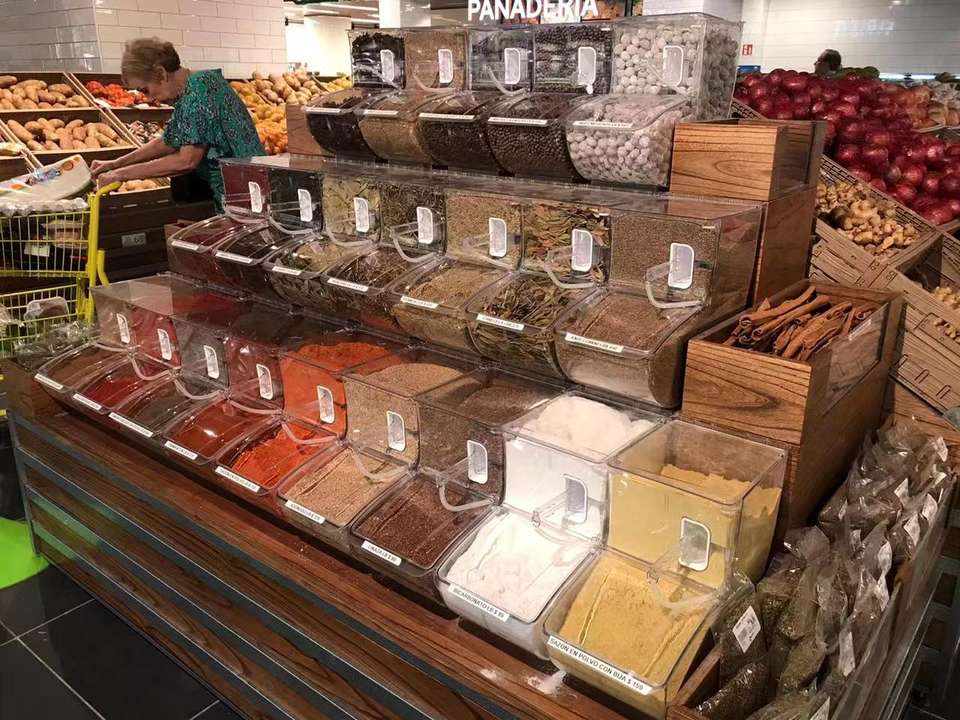 Épicerie affichage conteneur bacs de nourriture en vrac avec étiquette de prix