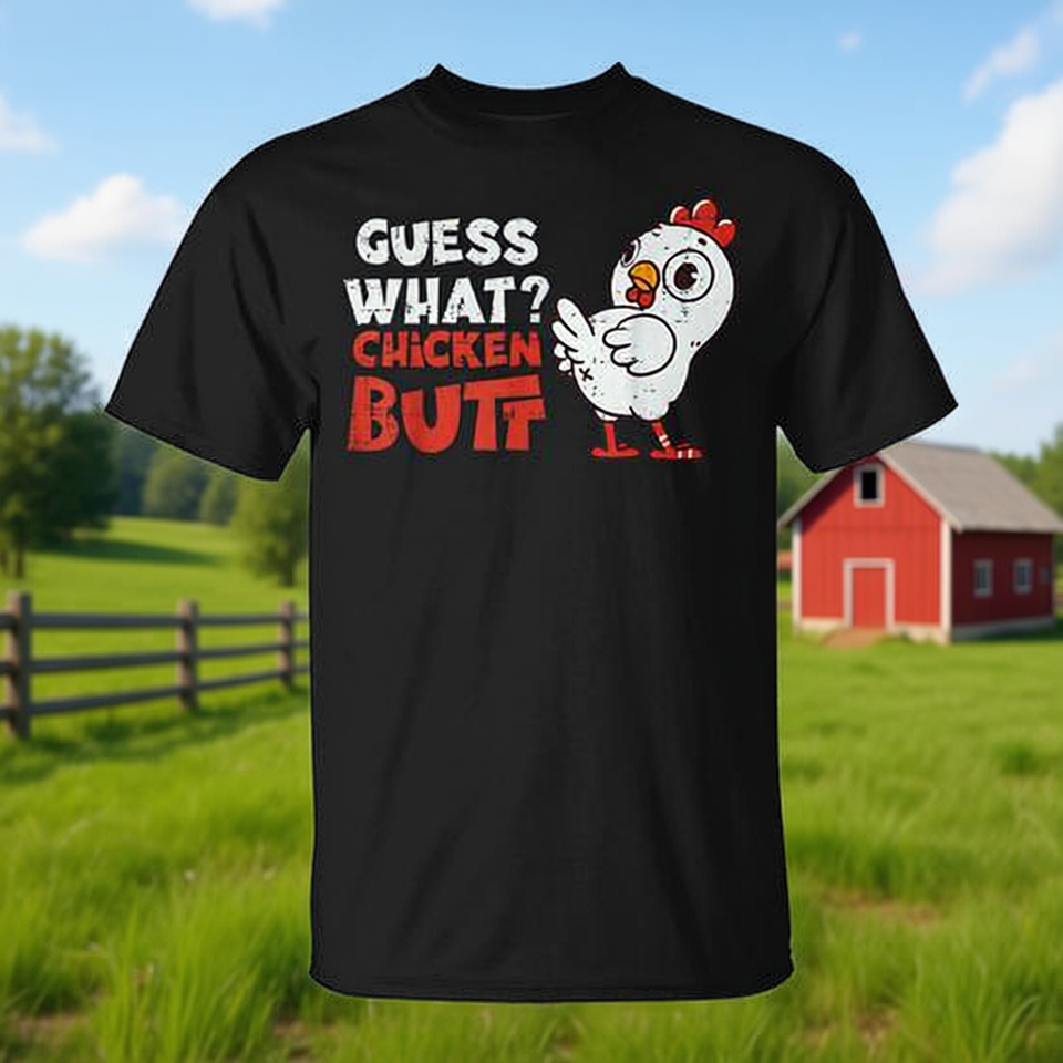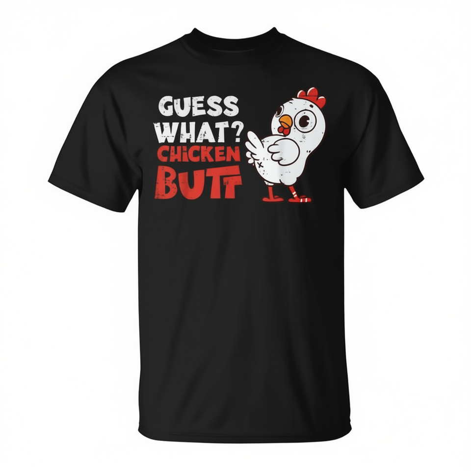 T-shirt à col rond et manches courtes pour femme avec impression numérique « Guess What Chicken Butt Farm Humor Joke », idéal pour une utilisation promotionnelle