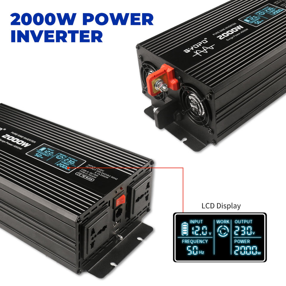 Gyopo 2000W onduleur hors réseau 2 KW convertisseur de puissance pour voiture convertisseur à onde sinusoïdale pure avec télécommande LCD USB type-c