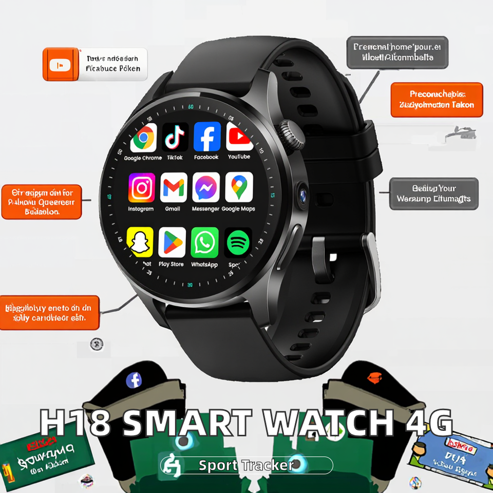 Montre connectée H18 avec carte SIM 4G, écran IPS, étanche IP67, caméra HD, GPS, sport, TikTok, YouTube, batterie 1100 mAh, Android, magnétique