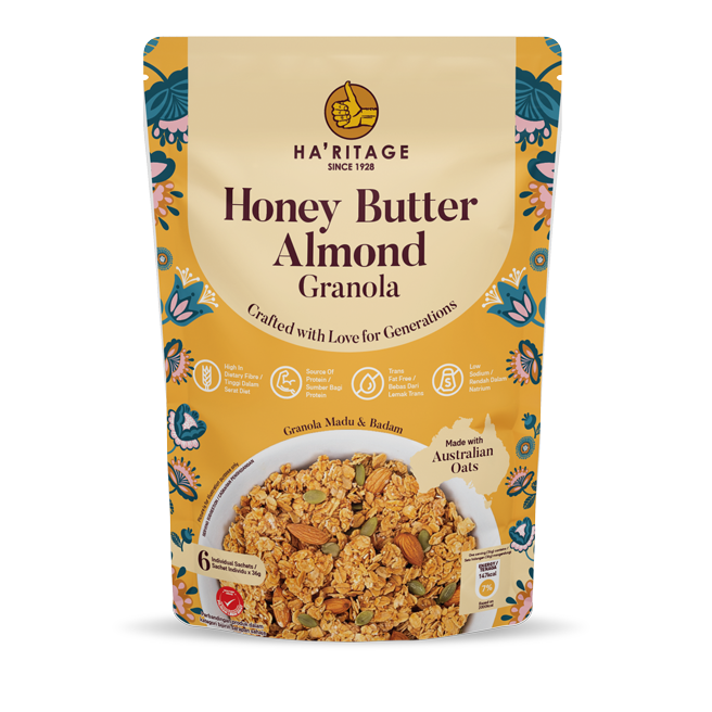 Céréales de petit-déjeuner cuites HA'RITEAGE au miel, beurre, amandes et flocons d'avoine, riches en fibres et en protéines, sans graisses trans, faibles en sodium, 216g