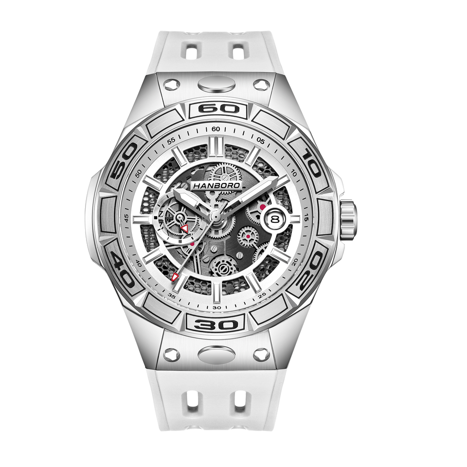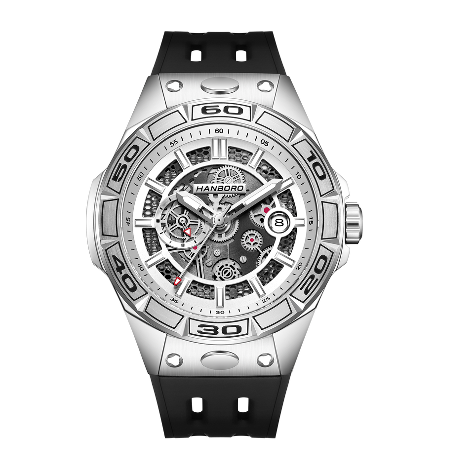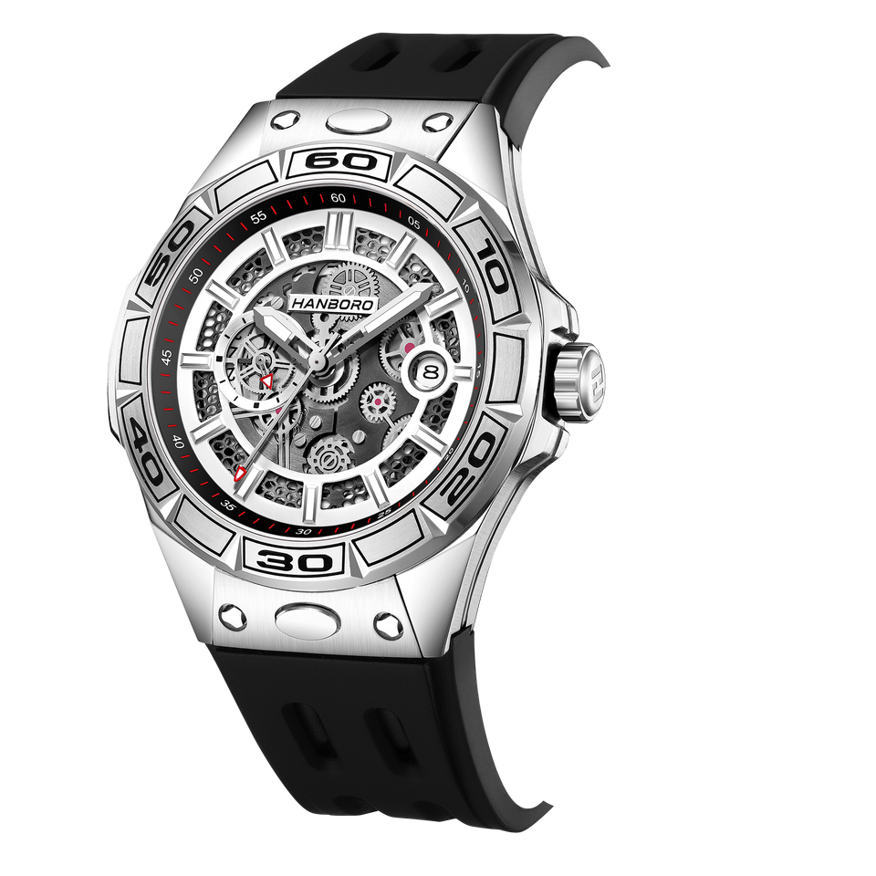 Montre mécanique automatique pour homme HANBORO, boîtier en acier inoxydable, cadran en cristal saphir, série Mech, bracelet en silicone à libération rapide