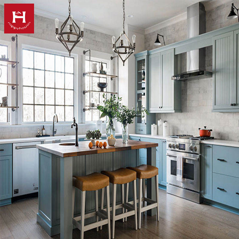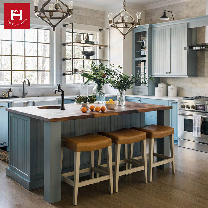 HAPPY HOUSES Ensemble d'armoires de cuisine en bois massif de style farmhouse américain avec îlot, armoire bleu clair personnalisée pour villa