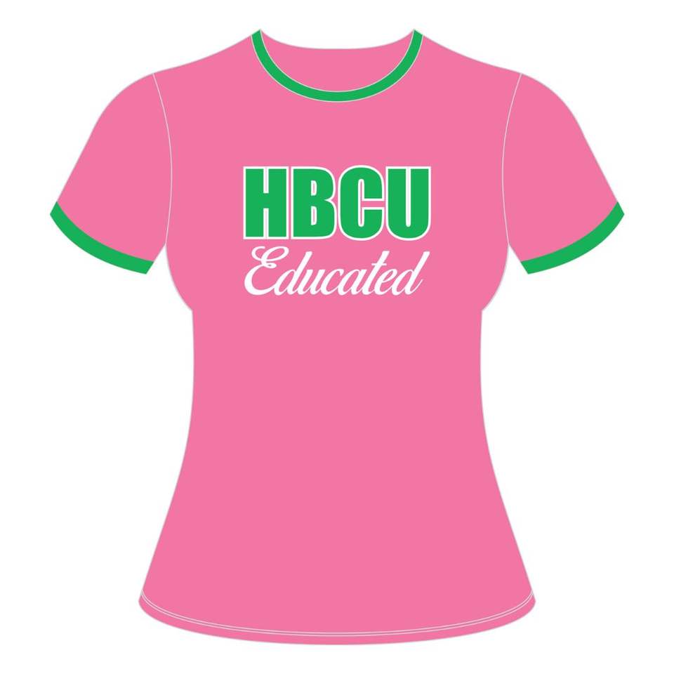 HBCU femmes instruites Chenille contraste garniture sonnerie t-shirt rose avec des lettres brodées vertes coton sororité vêtements grecs