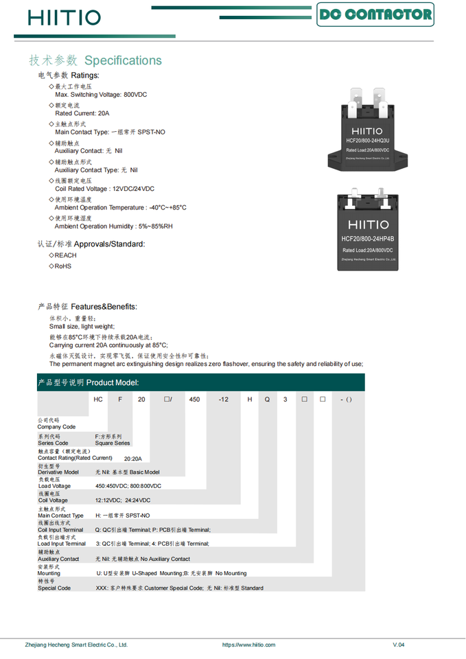 Contacteur CC HCF20B 1500V 20A à courant bidirectionnel, SPST-NO normalement ouvert, bobine 12V 24V 48V G201