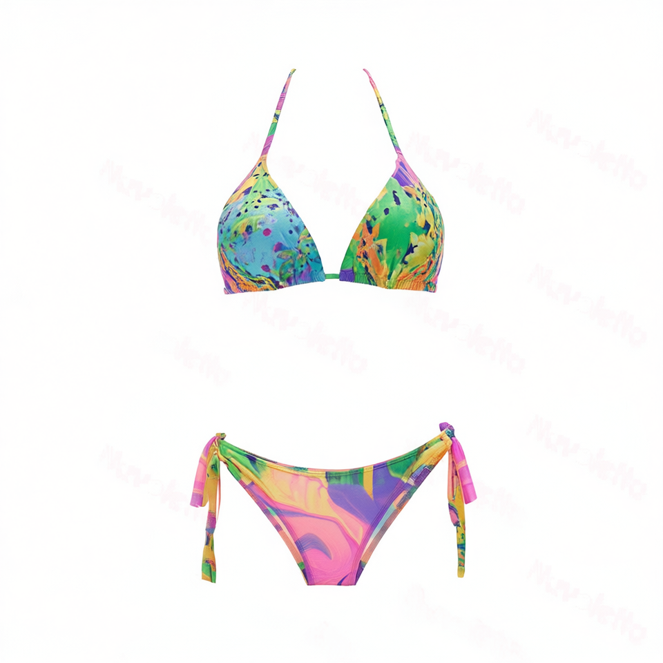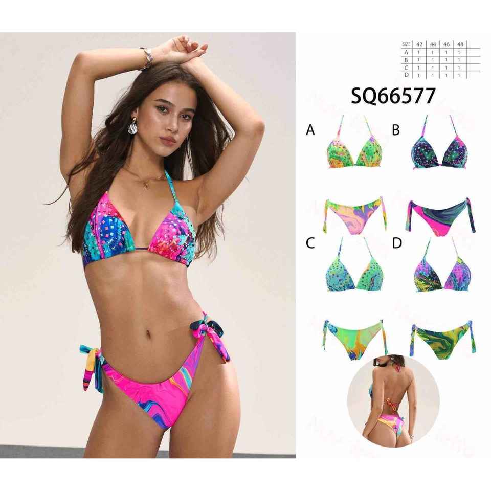 Ensemble de bikini HDJ imprimé multicolore, tailles 42, 44, 46, 48, maillot de bain pour femme, vêtements de plage, avec liens sur les côtés, extensible, en spandex et polyester