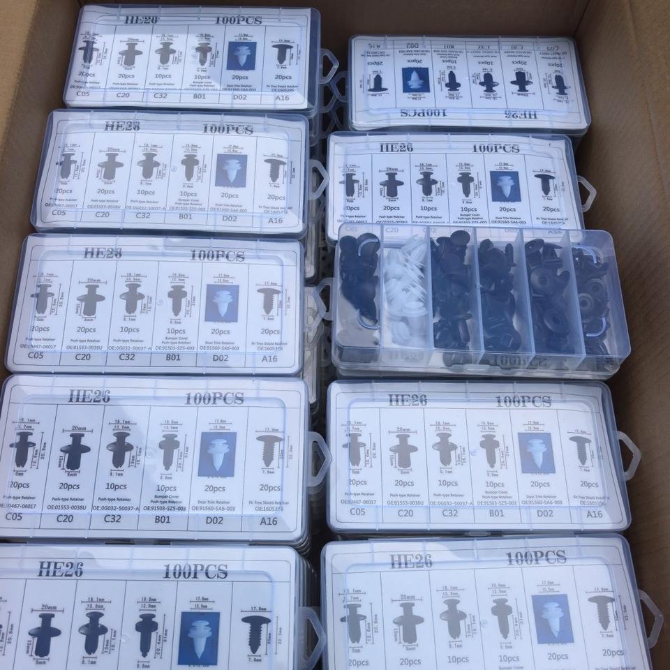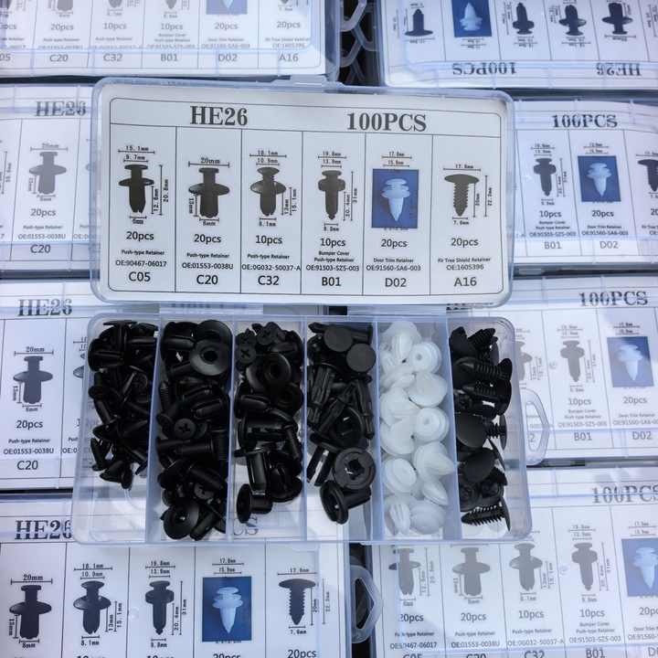 HE26 Nouveau Lot de 100 attaches de fixation pour voiture, 6 tailles, clips de fixation pour garniture de porte, pare-chocs universel, en nylon et plastique, système de retenue à poussoir