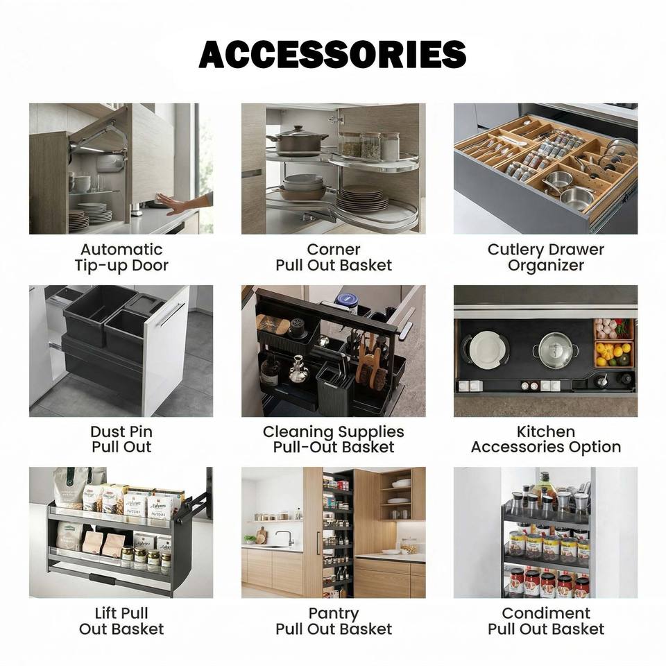 Accessoires:Conteneur de déchets, Coup de pied, Cabinet de base d'évier, Boîtes de riz, Stockage à plateau tournant, Charnière, Poignée et bouton, Robinet, Tiroir panier, Coulisse, Dosseret