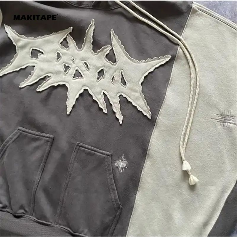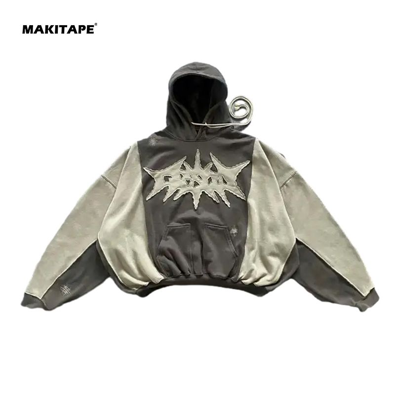 HG2016 Sweat à capuche épais pour homme, coupe à épaules tombantes, effet vieilli, avec appliques brodées, style vintage délavé à l'acide